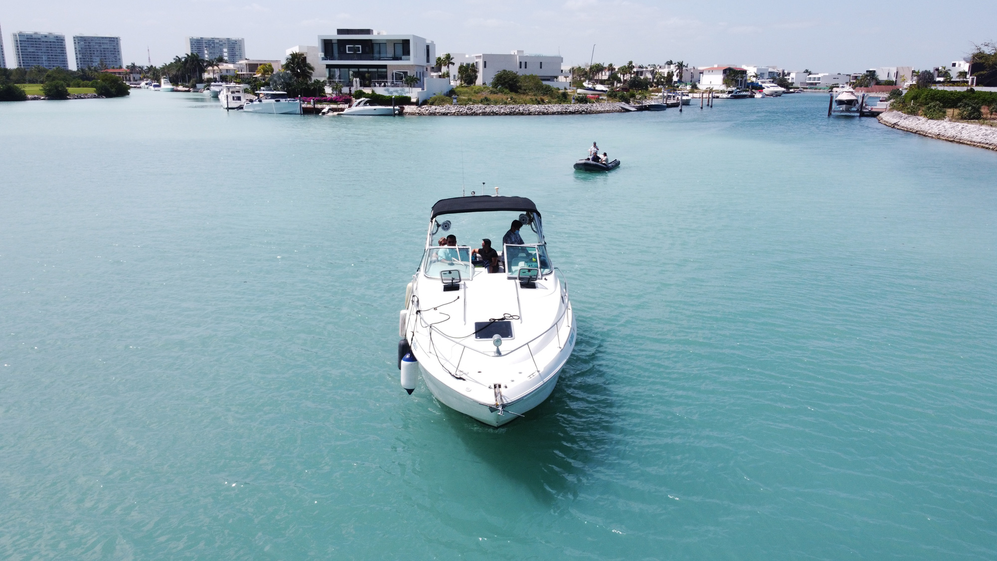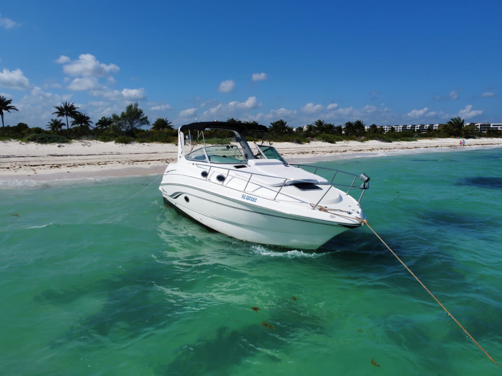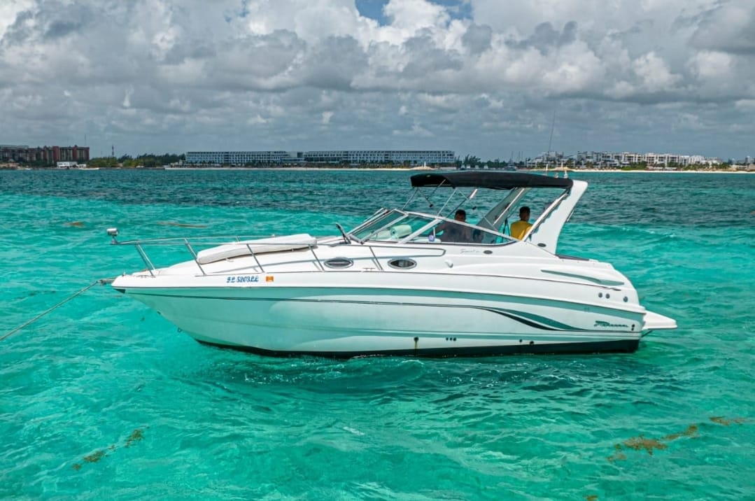 CHAPARRAL 33 FT 10 Guests 24 Beer 24 Water 24 Soft Drinks Ice Private Beach encounter Cabin – 1 bathroom – sun deck – Bluetooth Sound, Snorkel.